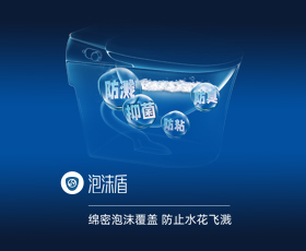 搭載獨(dú)特的“泡沫盾2.0”技術(shù),360°無死角泡沫潤壁,在馬桶表面形成致密泡沫層,有效的避免了濺水、粘黏、異味、病菌等難題,更人性化地解決如廁的問題,帶來超潔凈的如廁體驗。